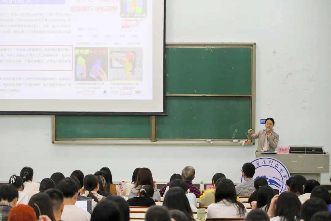 讲座伊始,朱宝莉女士以萝卜刀和自拍杆盗版横行的案例为切入点,巧妙地引领同学们深入领略知识产权布局所蕴含的深远意义,全面阐释了在当下社会发展进程中知识产权布局所发挥的不可替代的关键作用。朱女士鼓励同学们要深刻领悟并熟练掌握运用知识产权捍卫自身创新成果的有效方法,切实增强自身的核心竞争力。