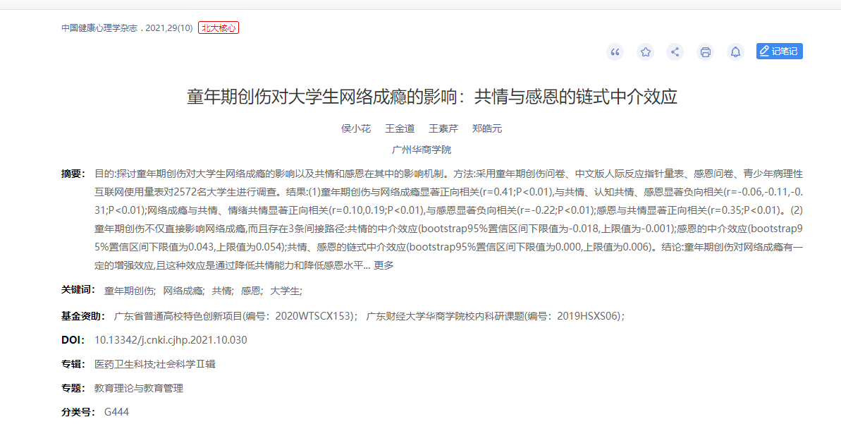 其中,侯小花老师在《童年期创伤对大学生网络成瘾的影响:共情与感恩的链式中介效应》一文中探讨童年期创伤对大学生网络成瘾的影响以及共情和感恩在其中的影响机制;