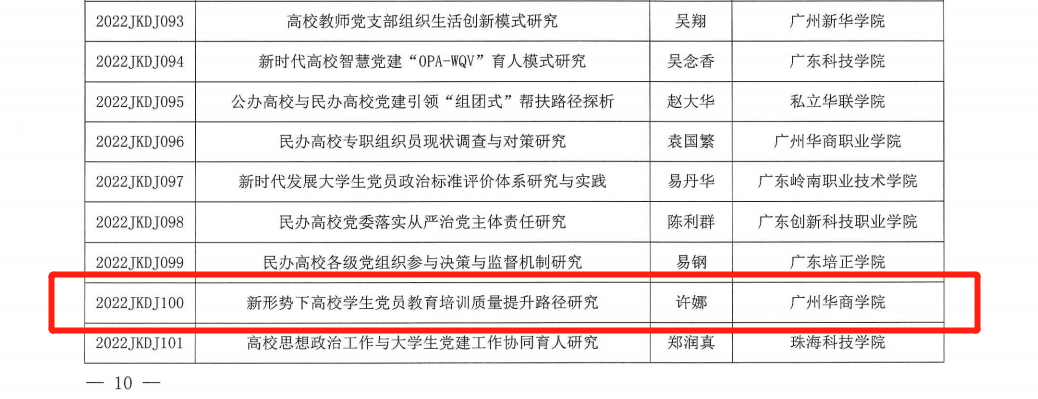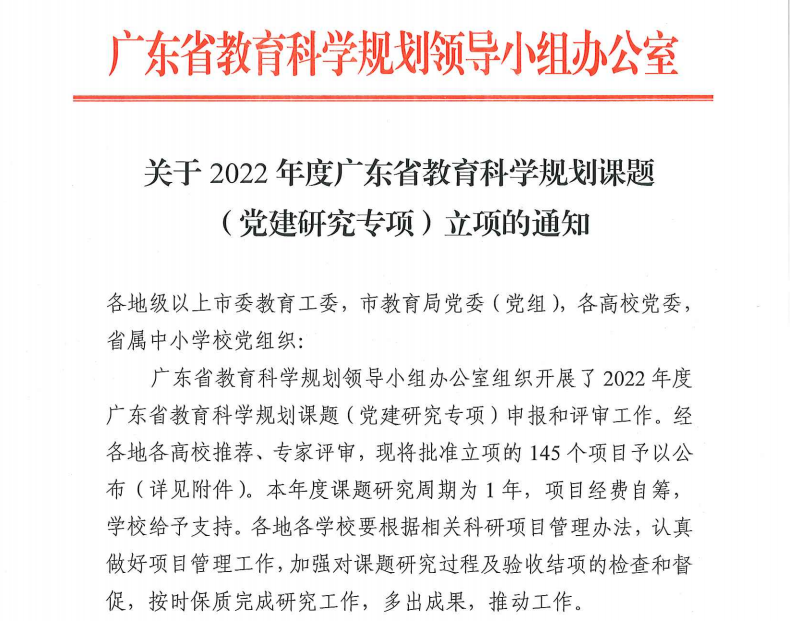 2022年5月12日,广东省教育科学规划领导小组办公室公布了2022年度省教育科学规划课题(党建研究专项)立项名单,威尼斯官网学生处许娜处长申报的《新形势下高校学生党员教育培训质量提升路径研究》(项目编号:2022JKDJ100)项目获批立项。