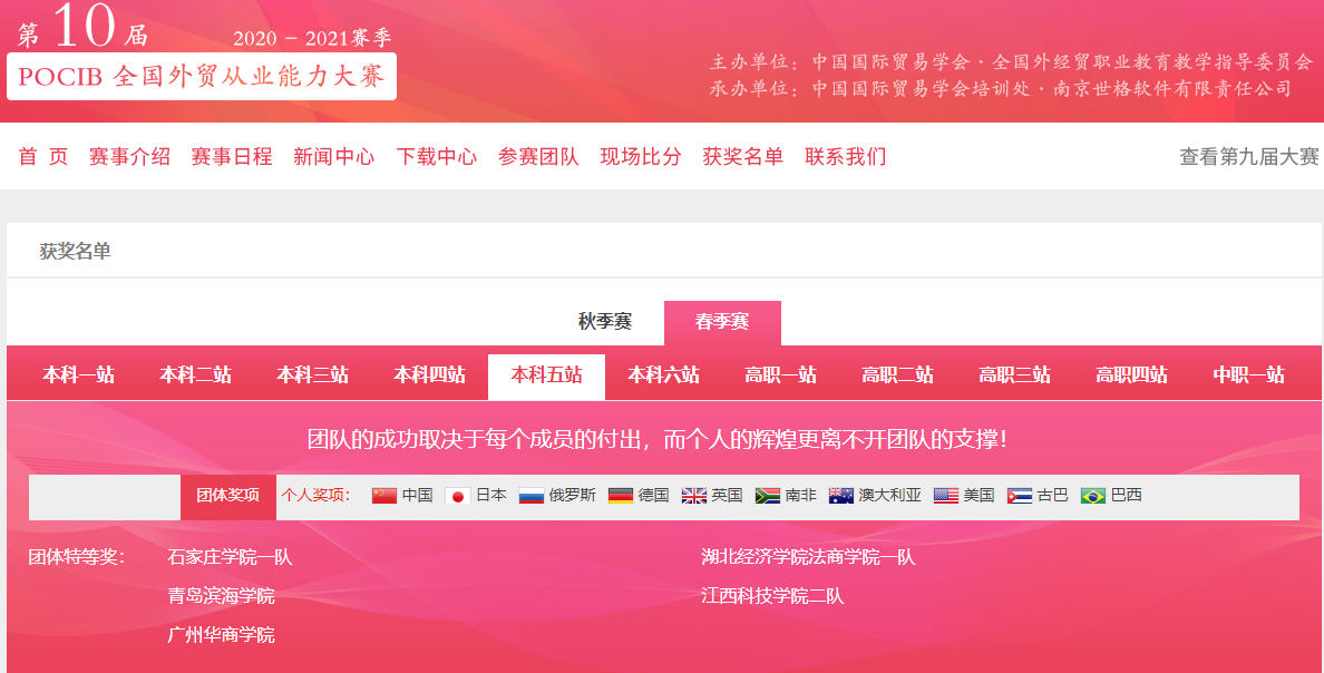 第十届POCIB全国外贸从业能力大赛(春季赛)共有210所院校(其中本科144个学校,高职62个学校,中职4个学校)、429支队伍、共计4290名选手参加。在指导老师黄丽霞、明小晴的带领下,经济与金融系10位参赛学生以团队第五的成绩,荣获团体特等奖,实现大赛二连冠!