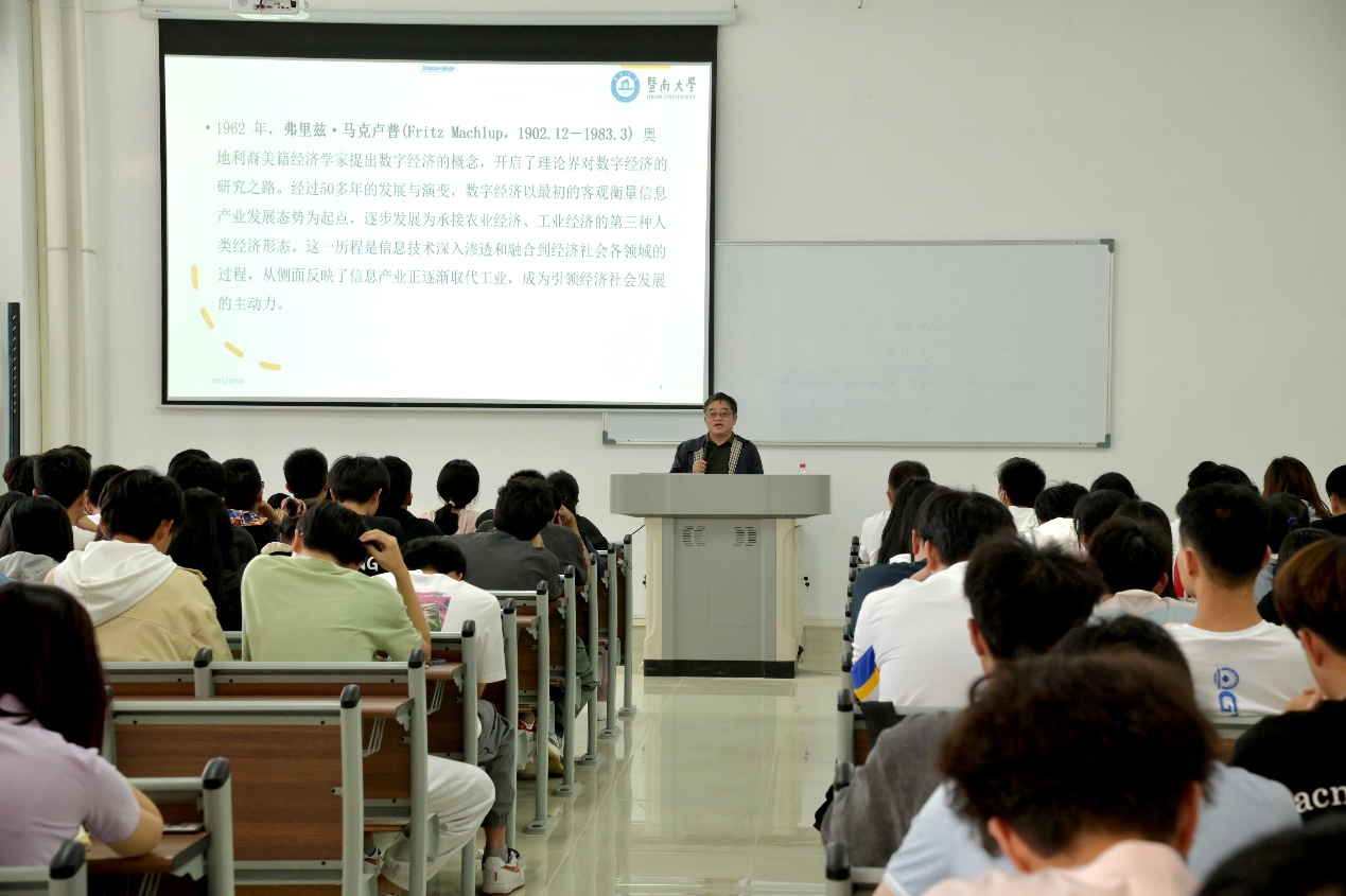 讲座开始前,同学们以热烈的掌声欢迎杨教授的到来。会议伊始,杨教授用通俗易懂的话语向同学们介绍了数字经济的概念特征,并指出以数字信息作为关键生产要素的数字经济将持续推动经济社会数字化转型、助推经济社会发展变革、加速重构经济发展与治理模式,已经成为学术界和各国政府的共识。同时他也指出我国数字经济在快速发展的同时也面临着一些问题:传统产业数字化转型缓慢、各国日益重视隐私信息的保护、产业发展不均衡、互联网平台的违规操作等方面带来的挑战。基于此,未来数字经济将朝“数字产业化、产业数字化”的方向发展,在促进消费数字化、投资数字化、贸易数字化以及服务的可贸易性,转变企业资产结构,提高政府治理效能,改变城市治理方式等方面赋能经济社会高质量发展。