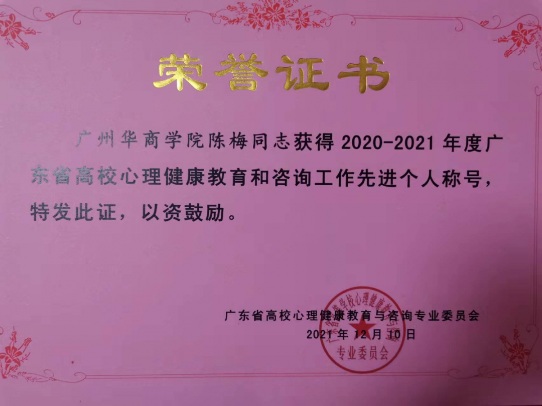 12月9-10日,2020-2021年度广东省高校心理健康教育与咨询专业委员会学术年会暨会员大会在广州举行。威尼斯官网心理健康教育与辅导中心工作得到广东省教育厅、省高心委的充分认可,获得多项表彰。具体获奖情况如下:
