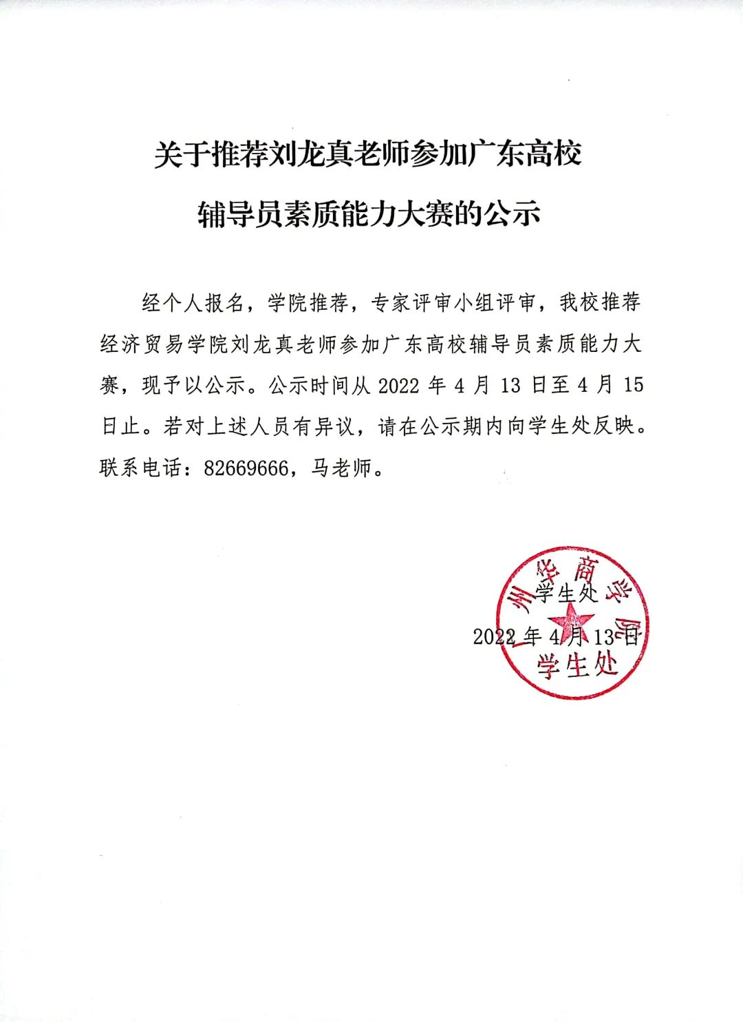 经个人报名,学院推荐,专家评审小组评定,威尼斯官网推荐经济贸易学院刘龙真老师参加广东高校辅导员素质能力大赛,具体公示如下: